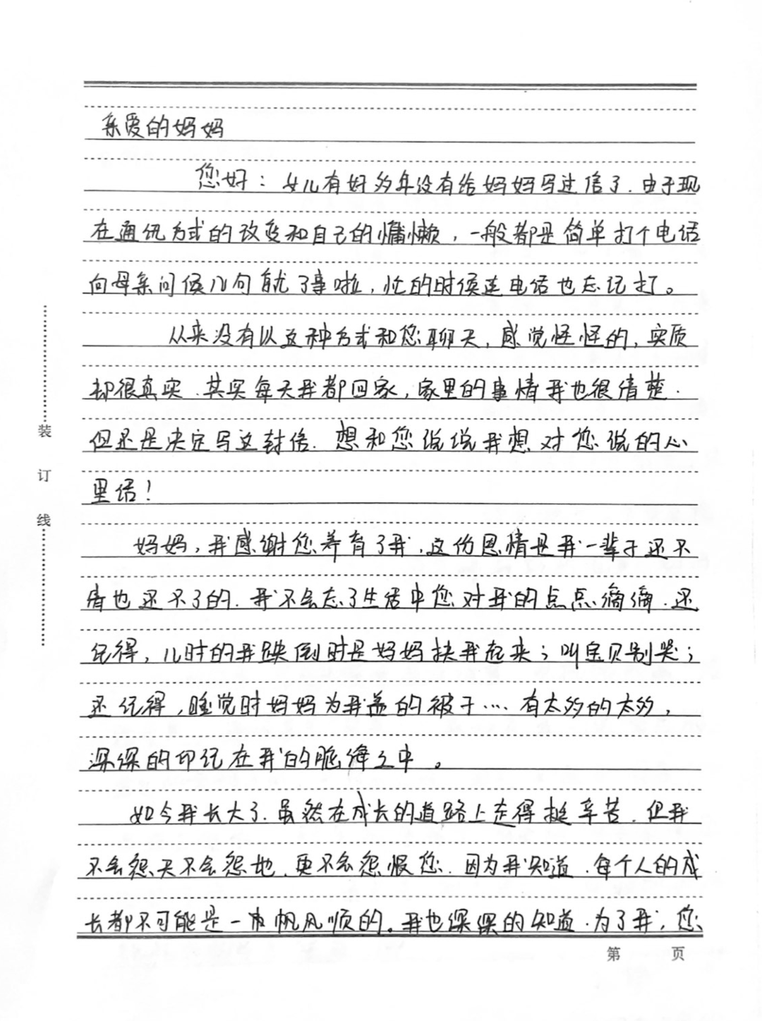 ——“妈妈,儿子已经长大,和儿媳一定会好好孝敬您二老的。祝您身体健康 ,万事如意!”